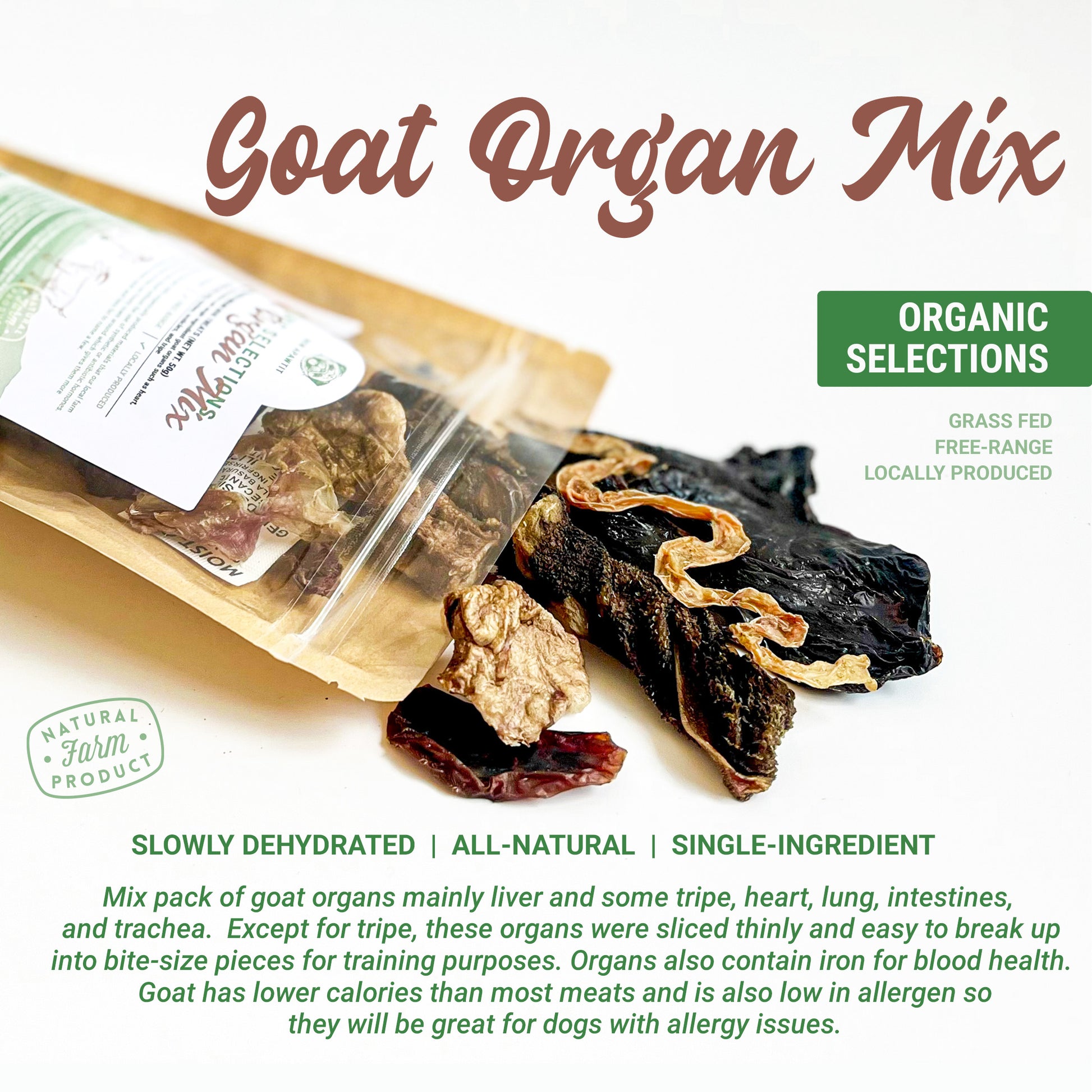 𝗒π—₯π—šπ—”π—‘π—œπ—– π—šπ—’π—”π—§ 𝗒π—₯π—šπ—”π—‘ π— π—œπ—«- Mix pack of goat organs mainly liver and some tripe, heart, lung, intestines, and trachea. Except for tripe, these organs were sliced thinly and easy to break up into bite-size pieces for training purposes. Organs also contain iron for blood health. Goat has lower calories than most meats and is also low in allergen so they will be great for dogs with allergy issues.